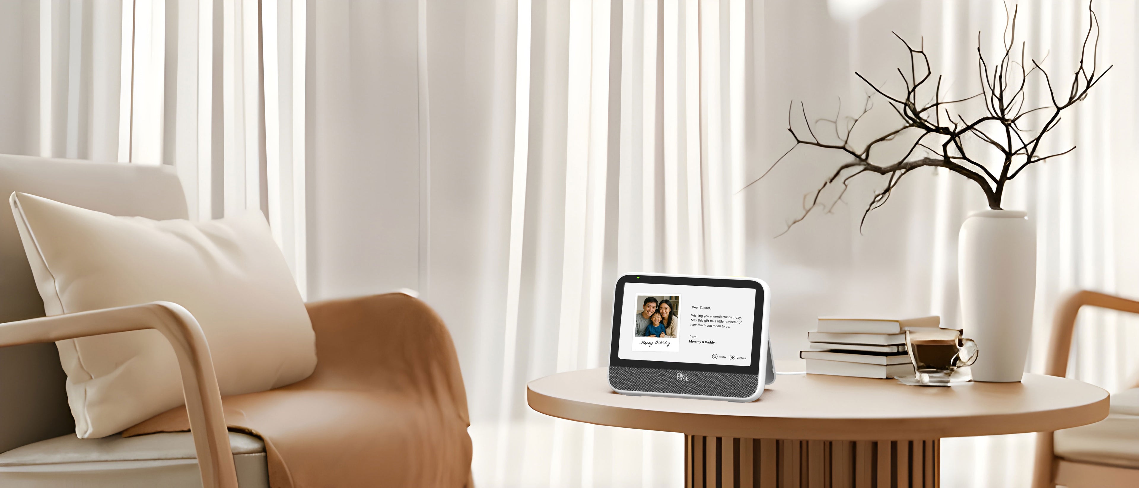 The first time the recipient powers on the Clario, that special greeting appears on screen—a beautiful, personalized surprise before they've even finished unboxing!