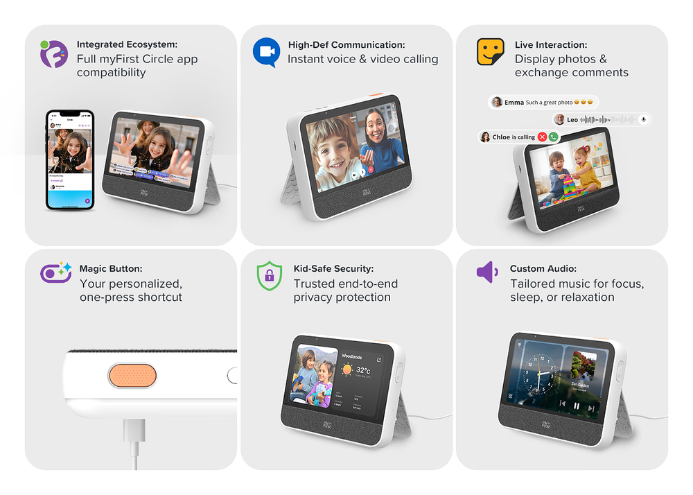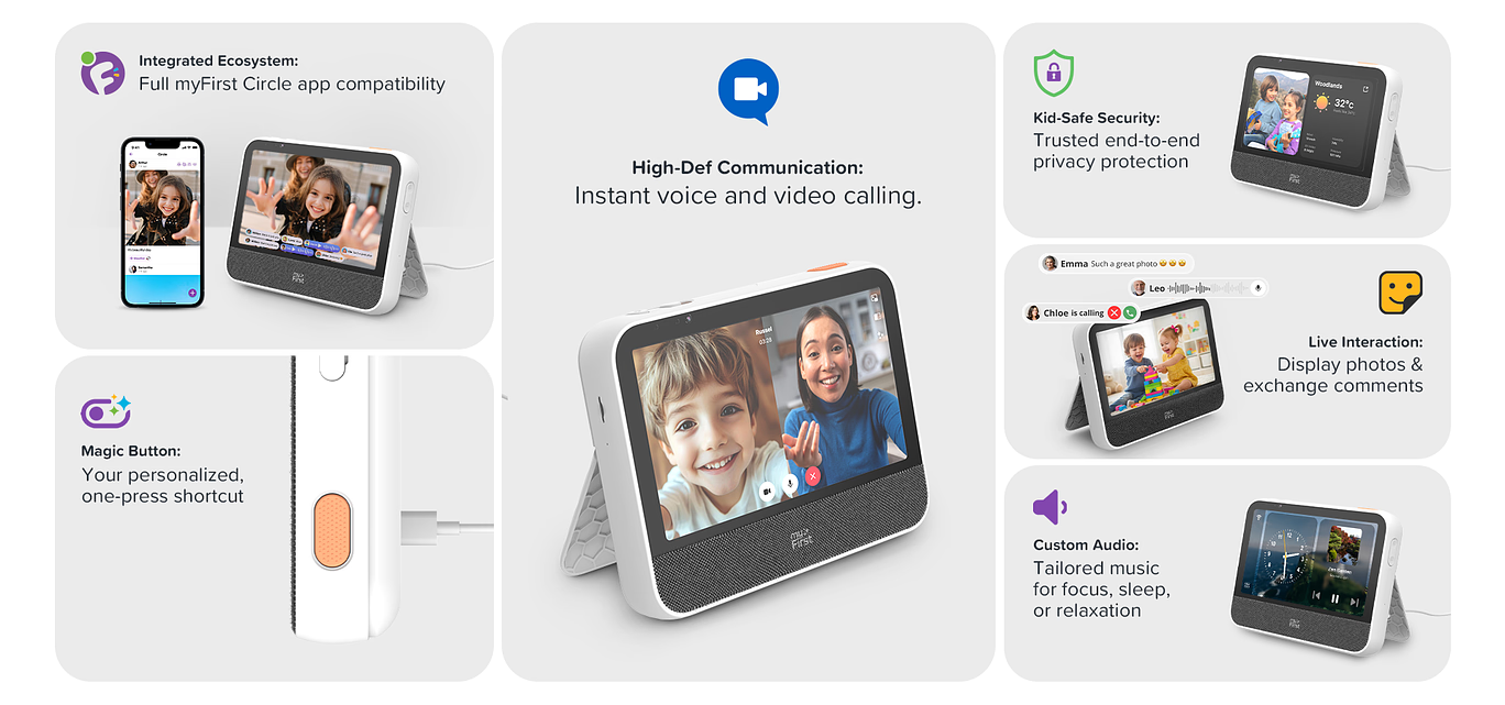 The Frame Clario is fully integrated with the myFirst Circle app, making it easy to connect with myFirst Fone, myFirst Camera, and other smartphones or tablets for seamless sharing and communication.