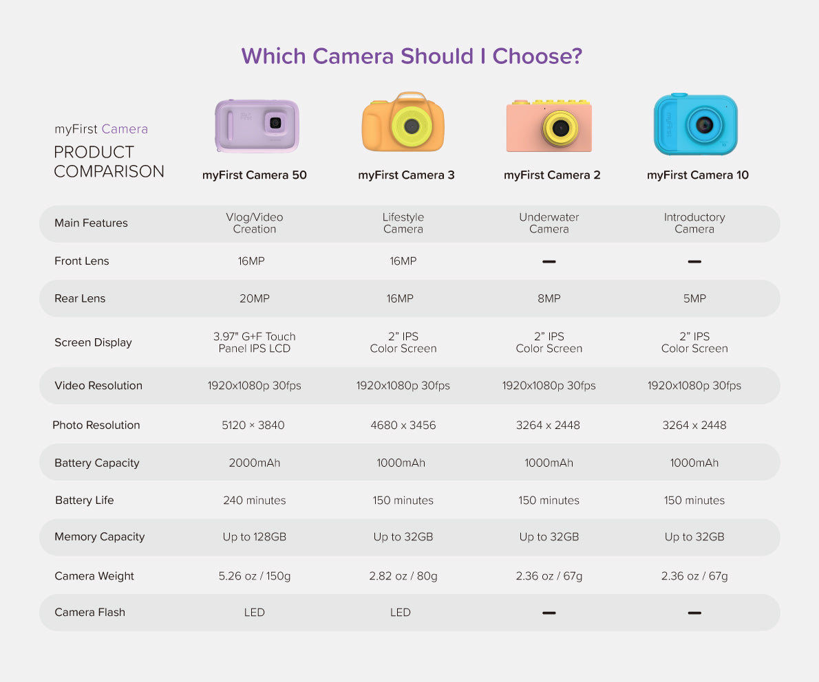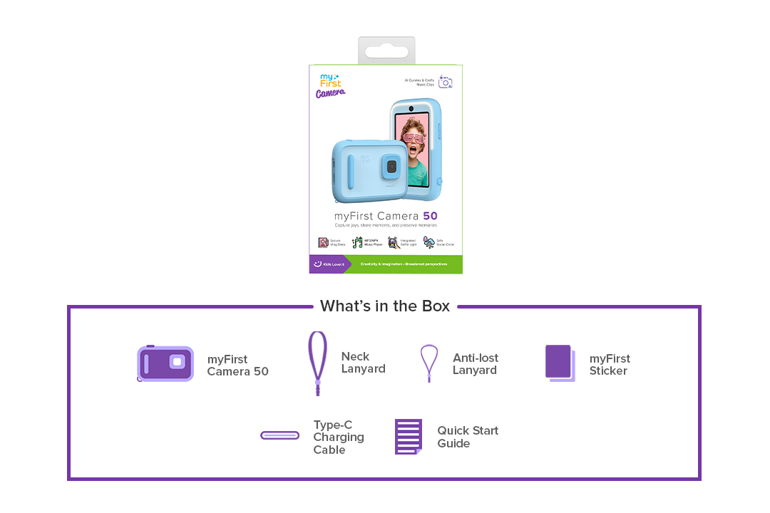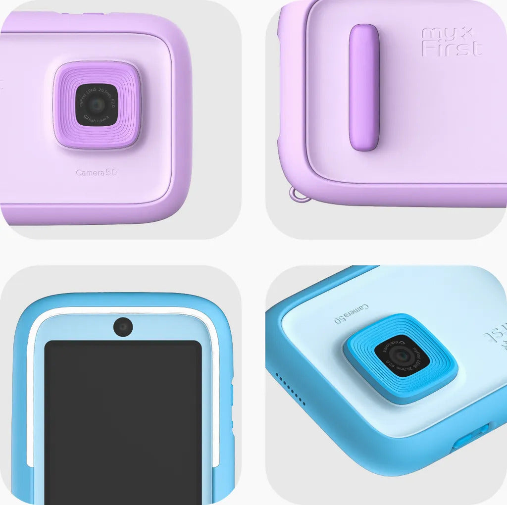 Camera 50 is part of myFirst children's tech collection and can sync photos with kids smart watches. Kids connect through voice and video calls, seamlessly integrated with myFirst Circle, a safe and fun alternative to social media for families. Share more smiles with approved contacts only.