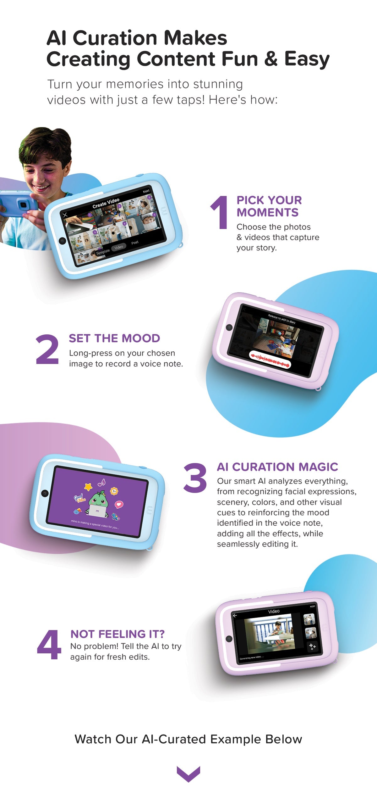 Our AI helps kids create amazing videos without the hassle. With simple tools and cool effects, they can add their own touch with stickers, drawings, and even their own voice!