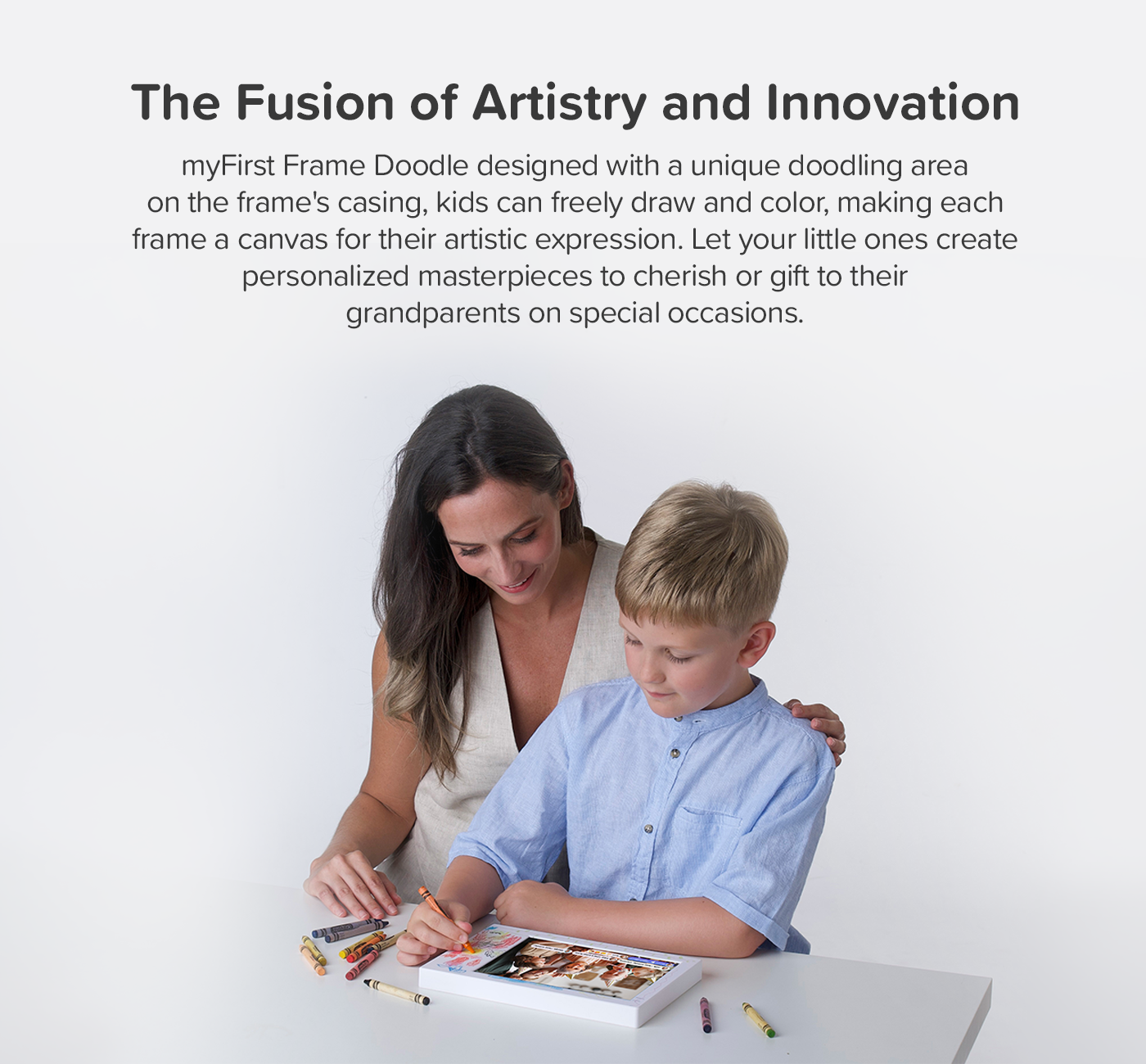 The myFirst Frame Doodle features a special doodling area on the frame’s casing, allowing kids to express their creativity. Children can draw and color directly on the frame’s surface, creating a personalized gift for their grandparents on special occasions.