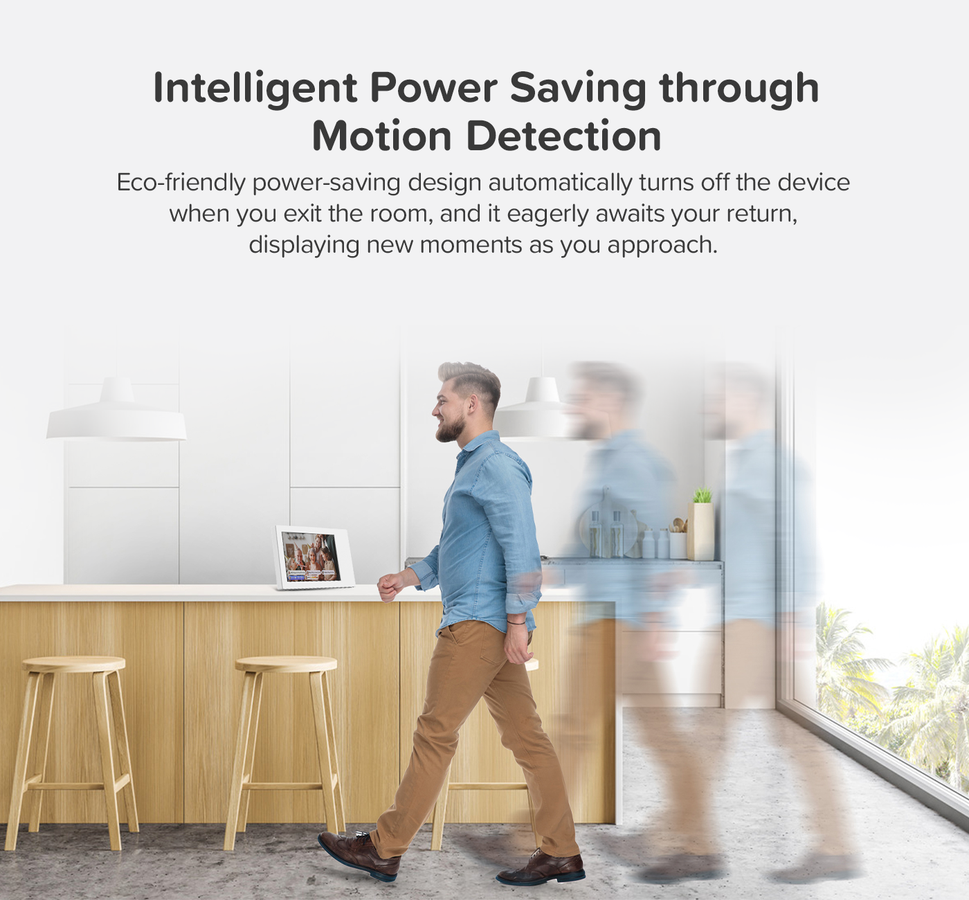 Our eco-friendly power-saving design automatically turns off the device when you exit the room, and it eagerly awaits your return, displaying new moments as you approach.