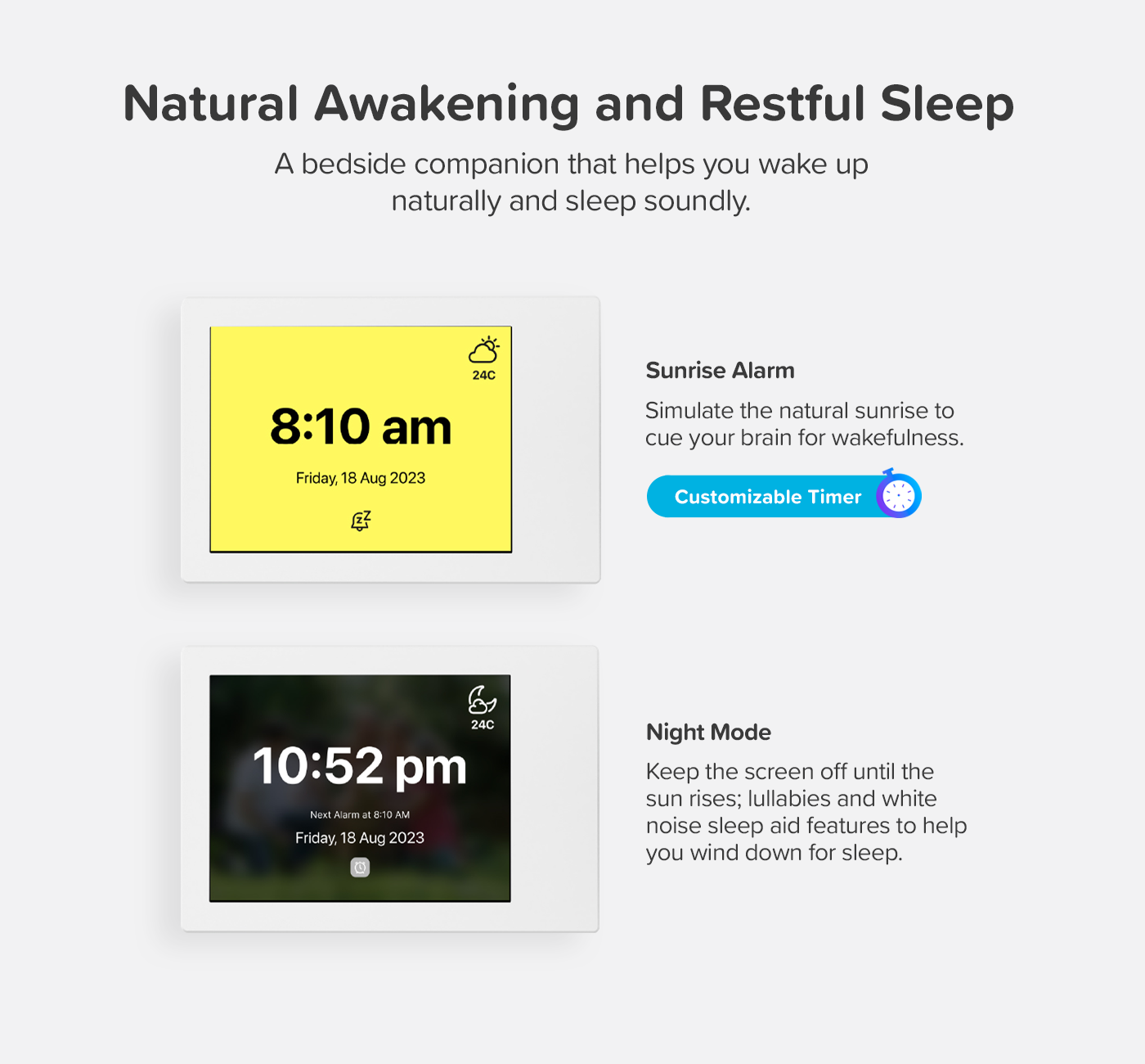 The Frame Doodle is a bedside companion that helps you wake up naturally and sleep soundly. It has a sunrise alarm that simulates the natural sunrise to cue your brain for wakefulness. It also has a Night Mode that keeps the screen off until the sun rises, lullabies and white noise sleep aid features to help you wind down for sleep, and a customizable timer.